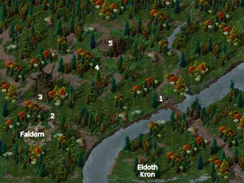 1. : Laskal est un druide de l'ombre (Xp : 1000, PV 49), le tuer engendre un perte de réputation. Pour qu'il ne vous attaque pas il faut répondre 2,2 ou que Faldorn soit dans votre groupe. 2. : Takiyah est un druide de l'ombre (Xp : 120, PV 44). 3. : Maison d'Amarande, Archidruide de l'Ombre : Amarande est un clerc de niveau 10 (Xp : 120, PV : 74). 4. : Izéfia est un druide de l'ombre (Xp : 120, PV 44). 5. : Nid de bébés wyvernes : Peter du Nord, guerrier neutre mauvais de niveau 4 (Xp : 240, PV : 46), est un dresseur de wywernes, et vous attaque avec ses 2 petites bêtes (Xp : 2 x 450). Eldoth Kron : Il vous propose un drôle de marché : Enlever Skie , fille du grand duc Entar Ecudargent qui se trouve dans sa maison à Baldur. En fait, il s'agit d'une mascarade pour duper le duc (en vue d'une rançon ), car Skie est complice. Faldorn veut exterminer tous les bandits qui profanent sa forêt, et souhaite vous rejoindre. |