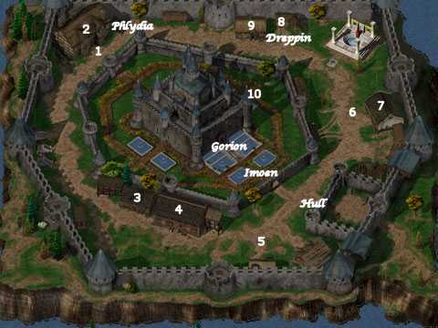 1. : Vous commencez le jeu ici. 2. : L'auberge de Château-Suif, tenu par Winthrop : - A l'intérieur vous trouver PerleFlamme Cheveux d'Elfe qui vous demande d'aller récuperer un parchemin d'identification auprès de Théthoril (10) (xp : 50, 1 potion de soins, vous lance une protection contre le mal). - Dans un coffre fermé à clé vous trouverez un saphir d'une valeur de 1000 po, mais pour l'ouvrir il vous faudra au moins 60% en crochetage. Note : n'oubliez pas d'acheter les carreaux pour Fuller (3). 3. : Baraquements : - C'est ici que ce trouve le coffre de Hull qui contient son épée (Quête de Hull) et un antidote (Quête de Dreppin) pour soigner sa vache. - Fuller vous demande de faire ses courses : vous devez lui acheter des carreaux d'arbalette (xp : 50, dague +1). 4. : Dortoir : Carbos, un assassin, vous attend (xp : 20, dague). 5. : Le portier vous propose une initiation au combat de masse chez Obe l'illusionniste. 6. : Jondalar et Eric testent votre connaissance au combat. 7. : Reevor vous demande de le débarrasser des rats qui se trouvent dans son entrepot (xp : 50, 5po). 8. : Livre de l'histoire d'Halruaa que vous devez rapporter à Phlydia. 9. : Shank, un assassin, vous attend (xp : 20, dague). Dans les coffres vous trouverez quelques armes. 10. : Théthoril détient le parchemin d'identification que cherche Perleflamme Cheveux d'Elfe (2). Imoën : C'est une amie d'enfance. Gorion : Allez le voir pour quitter Château Suif. |
