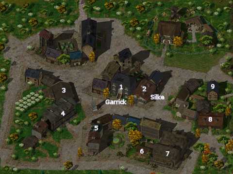 1. : Le magicien ardent, auberge modeste dans laquelle on trouve : - Zhurlong, un voleur qui c'st fait voler (mdr) ces bottes de furtivité par un hobgoblin au sud de la ville (ar3800). Rapportez lui (Xp : 300, 100 po + ce qu'il vous a volé), puis tuez pour récupérer les bottes (pas de perte de réputation). 2. : La gerbe rouge : - A votre arrivé un chasseur de prime, Karlat, vous attaque (Xp : 270) - Perdué à perdue (mdr) son épée à Haute Haie (ar3200), il vous demande de lui rapporté (Xp : 500). 3. : Comptoir de Kagain : - Dirige une compagnie de gardes de caravanes. Il veut retrouver le fils d'Entar Ecudargent (un des ducs de la porte de Baldur). 4. : Auberge de Feldpost : - Dès que vous entrez Marl cous accoste, soyer cool avec lui, pour le calmer répondez 1,1,3,3,1 (Xp : 900), vous pouvez aussi le tuez (ou faire les deux) il n'y a pas de perte de réputation (Xp : 650). - Au 1ier vous trouverez Algernon, qui possède la cape du même nom, vous pouvez soit lui voler soit le tuer, mais cette dernière solution entraîne une perte de réputation. - Si vous êtes au chapitre 3, vous trouverez Tranzig, c'est le contact entre Mulahey et Tazok. En le tuant vous récupèrez un parchemin indicant l'emplacement du camp des bandits (Xp : 975, anneau de protection +1), ou pouvez le laisser en vie il vous emmène alors au camp. 5. : Maison de Perleflamme d'elfe : Il recherche l'Histoire de la pièce fatidique (Xp : 300, reputation +1). 6. : La maison de Landrin : Cette maison est habitée par 4 araignées colossales (Xp : 120), dont vous devrez ramenez le corps à Landrin ainsi que la vieille bouteille, la paire de bottes se trouvant dans le coffre. 7. : Le Jongleur Jovial : - A partir du chapitre 3 la commandant Vaï s'y trouve. Elle rachète chaque scalp de bandit pour 50 po mais aussi les têtes de Wivernes pour 1000 po. Revenez la voir au chapitre 5 et vous gagnerez +1 en réputation. - Bjornin, un paladin, vous demande de tuer les demi-Ogres qui sévissent au Sud Sud-Est de la ville, dans les montagnes. - Gurke, s'est fait volé sa cape par des bandits de Bois-Manteau, il vous demande de la lui ramener (Xp : 300), mais lorsque vous lui ramenez il vous la rend. 8. : Forge de Grondemarteau, tenue par Taërom Fuiruim : - Si vous lui apportez une tête d'ankheg, il vous l'achêtera 500 po et pourra confectionner une superbe armure d'ankheg (20 000 po) deux semaines plus tard. Mais vous pouvez aussi décliner son offre il vous proposera alors de vous fabriquer l'armure pour 4000 po. Note : le magasin n'est ouvert que le jour, la nuit il est vide (profitez en pour fouiller les coffes). 9. : Maison de Mirianne : Mirianne aimerait avoir des nouvelles de son mari. Une fois rassurée sur son sort par un message (ar3800) elle vous remerciera chaleureusement (Xp : 300, anneau de protection +1). Garrik vous propose de le suivre afin d'aider sa maitresse qui est poursuivie par de soi-disant "voyous" de Feldpost. Silke, barde neutre mauvais de niveau 10 (Xp : 900, PV : 29), vous pouvez soit la défendre (peu d'Xp, baisse de réputation) ou l'attaquer (potions, baton +1). |