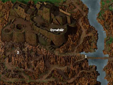 1. : Gnarl et Dentpoilue, 2 ogrillons de niveau 2 (Xp : 2 x 175, PV : 20), ont pour mission de défendre le pont. Vous pouvez soit leur donner 100 po pour passer (Xp : 250), soit vous battre (gantelets de dextérité). 2. : Dans cette grotte vous trouverez un traité d'autorité et d'influence Dynahéïr vient d'un pays lointain et cherche la protection de Minsc. Plusieurs choses peuvent se passer suivant qui est dans votre groupe : - Si Minsc est avec vous, elle veut se joindre à vous, si vous refusez elle et Minsc quittent le groupe et s'en vont, si vous accepté tout de suite (réponse 1), elle se joint à vous et vous êtes récompensé (Xp : 800). - Si Edwin est avec vous, vous êtes récompensé de l'avoir sauvée (Xp : 800) et un choix vous est demandé. En effet Edwin veut sa mort, si vous refusé de la tuer (réponse 1) elle vous remercie (Xp : 800) et se joint à votre groupe pendant que Edwin s'en va, si vous accepter de la tuer (réponse 2) elle et Minsc vous attaque, pour la réponse 3 surprise ! - Si ni Minsc, ni Edwin n'est avec vous, elle veut se joindre à vous, si vous refusez elle quitte le groupe et s'en va, si vous accepté tout de suite (réponse 1), elle se joint à vous et vous êtes récompensé (Xp : 800). |